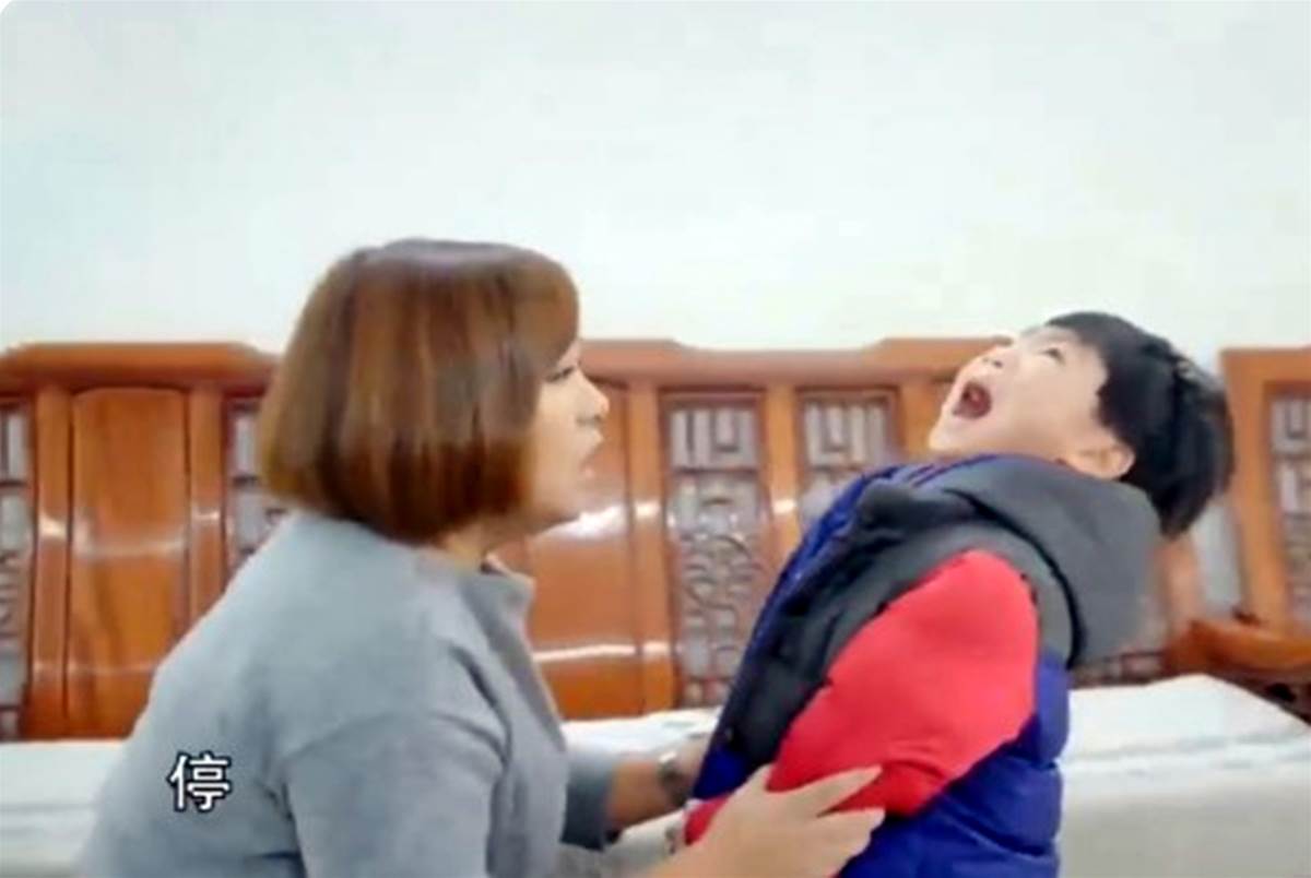 視訊開始出現了一個叫志昕的小男孩,聲嘶力竭地哭泣,邊哭邊摔東西,掀翻了客廳的茶几,拿著塑膠凳子狠狠地砸媽媽,在家裡暴走,走到哪摔到哪兒。之後家裡一片狼藉,而媽媽只能無助地站在一旁。